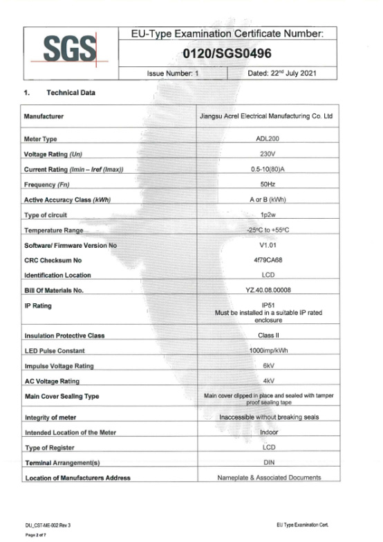 After SGS (UK) MID technical experts comprehensively, rigorously and carefully guide and review Acrel din rail energy meters, it is confirmed that the quality of ADL200 single-phase din rail energy meter produced by Jiangsu Acrel Electrical Manufacturing Co., LTD. complies with MID related standards, and on July 22, 2021, SGS (Finland) agency officially issued MID certificate(Certificate No. 0120/SGS0496) to our company. The MID certificate of Acrel ADL400 three-phase din rail energy meter is also in the process of obtaining evidence, which is expected to be completed in early September.